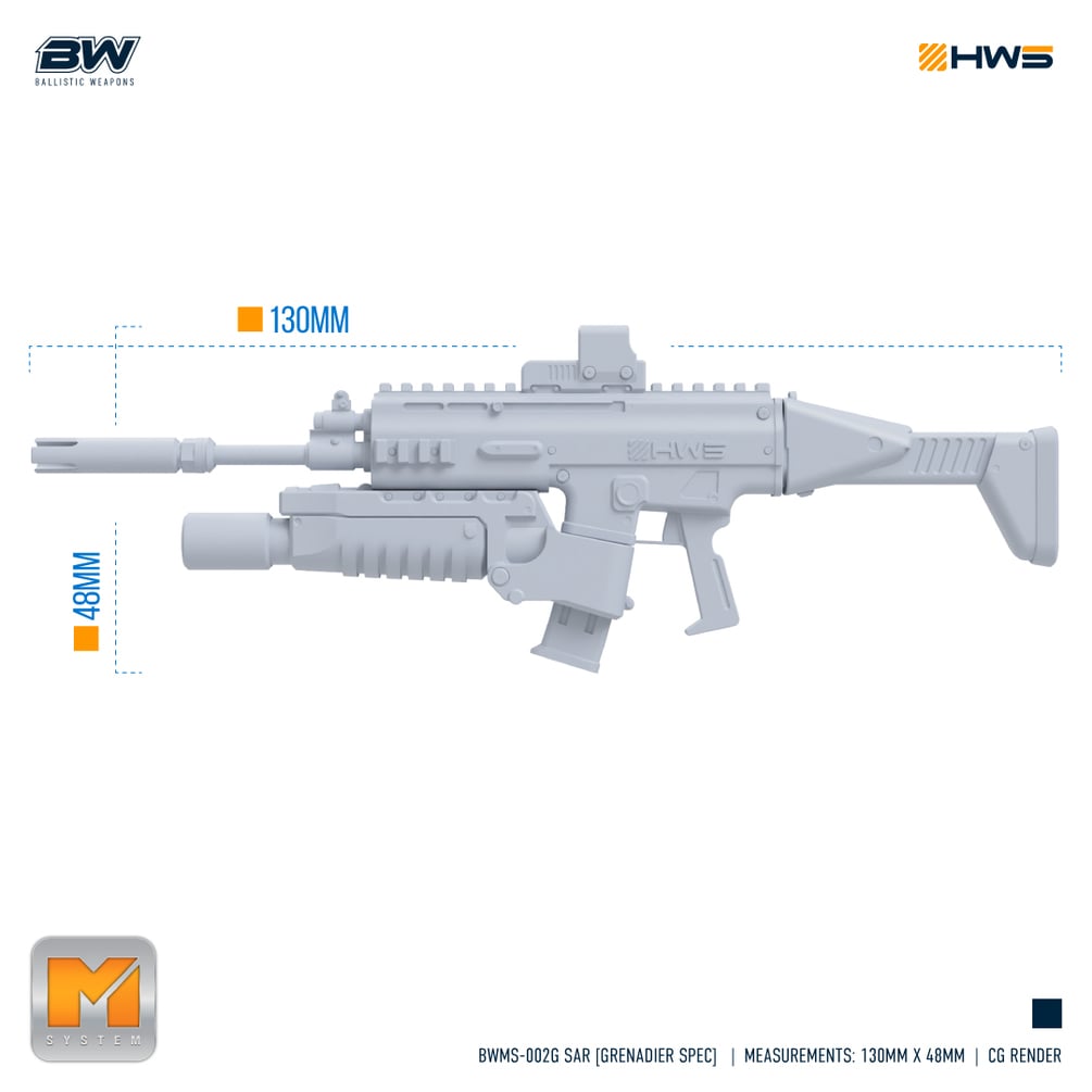 BW for Ballistic Weapon Series & MS for Modular System (M-Sys for short) the Standard Assault Rifle is now equipped with HWS Modular System Technology. This means that the BW-002G can swap out parts with other M-Sys weapons like the full SAR line of rifles!